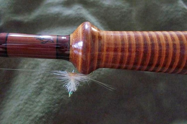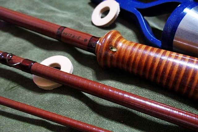 Custom Steffen Brothers 8' 3 piece 3/4 weight fiberglass rod with stacked leather handle and brass McKeeper hook keeper installed in grip. This model throws a 4 weight like few, if any, could match for sweetness.
