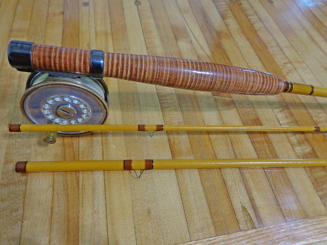 For a considerable time I've toyed with the idea of putting stacked leather handles on fly rods as an alternative to the standard cork and wood arrangement. Stacked leather handles have long been used as a handle material on fixed blade knives as well as hatchets, and has the reputation as a very durable material, as evidenced by many knives that have stood the test of time. I've owned a number of Marbles knives that were well over 100 years old and their handles still looked new, in spite of the fact that they didn't even a have a finish applied when new. So why not on a fly rod? A 100 year old fly rod with a cork handle will be in dire need of a replacement by then if it was used regularly over that span, but a rod made with a leather grip will probably be just hitting its stride by then, especially when a fine finish was applied when new. It has the added benefit of being touched up or refinished easily with a rubbed in coat of Tru-Oil, should it start to show any sign of wear, but that would take a long time to get to that point. It is heavier than an equally sized cork and wood arrangement by 1 1/2 ounces, but with that extra weight in your hand while casting it's hardly noticeable. It feels great in the hand, is not slippery at all and it looks great on a fly rod.